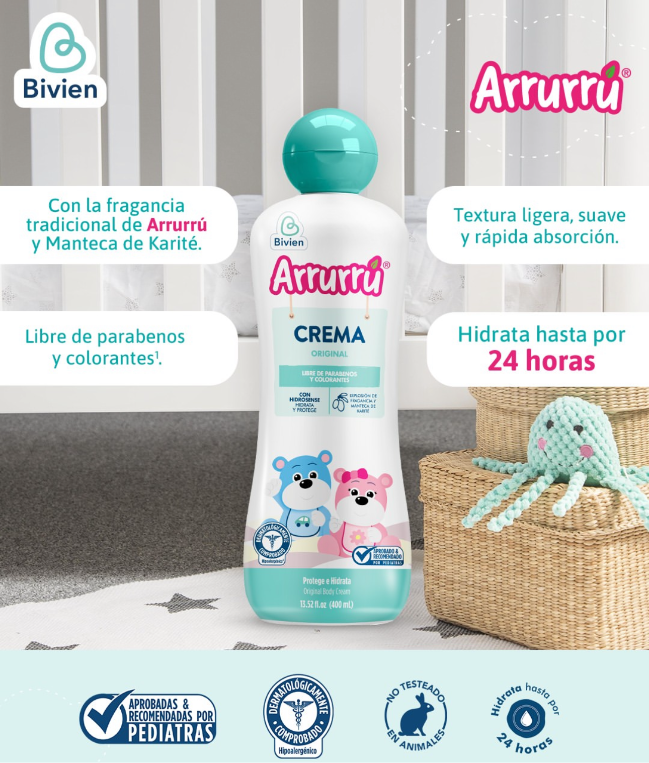 La piel del bebe requiere de especial atención y cuidado, Arrurru crema original con Hidrosense (mezcla de ingredientes naturales únicos de Arrurru) cuida la delicada piel del bebe, humectándola y dejándola suave y protegida de agresiones externas hasta por 24 horas.