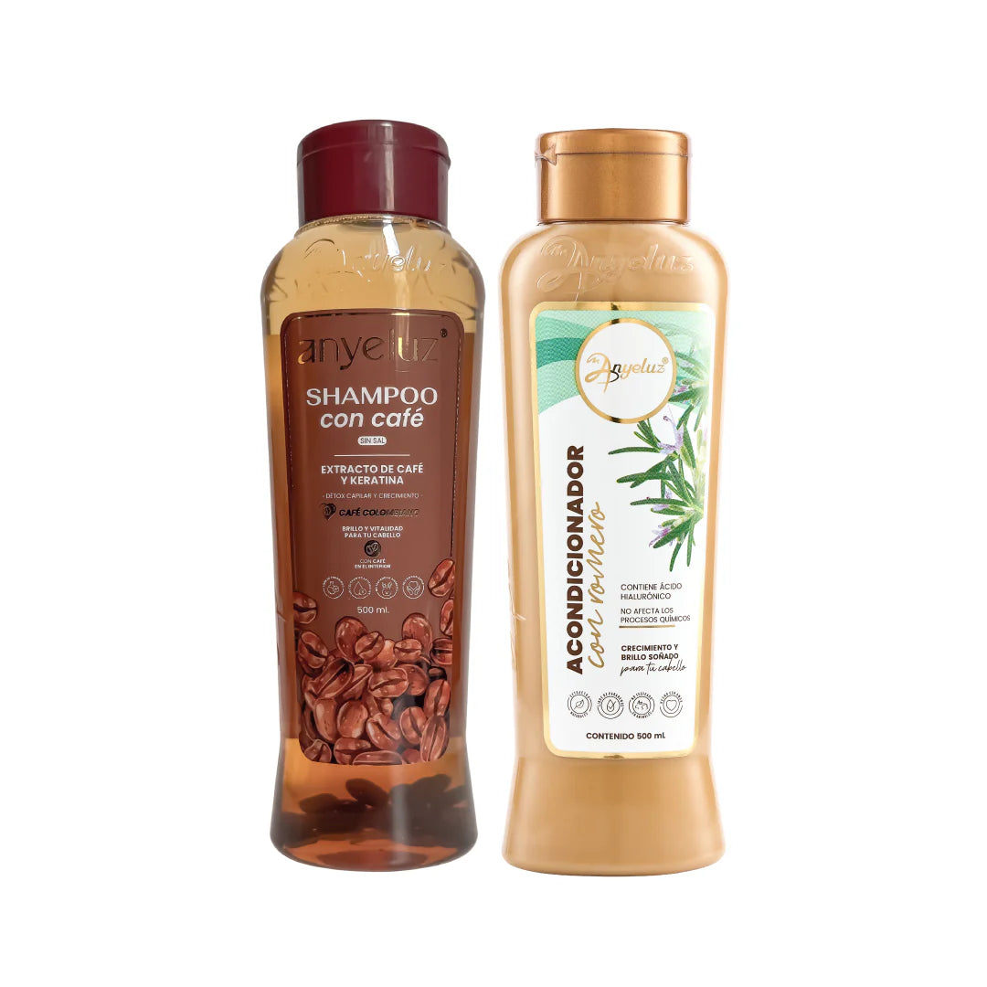 Este dúo es ideal para quienes buscan un cabello limpio, ligero y saludable. El shampoo con café realiza un detox capilar, eliminando impurezas y residuos acumulados, mientras que el acondicionador con romero complementa la limpieza, aportando frescura y fortalecimiento.